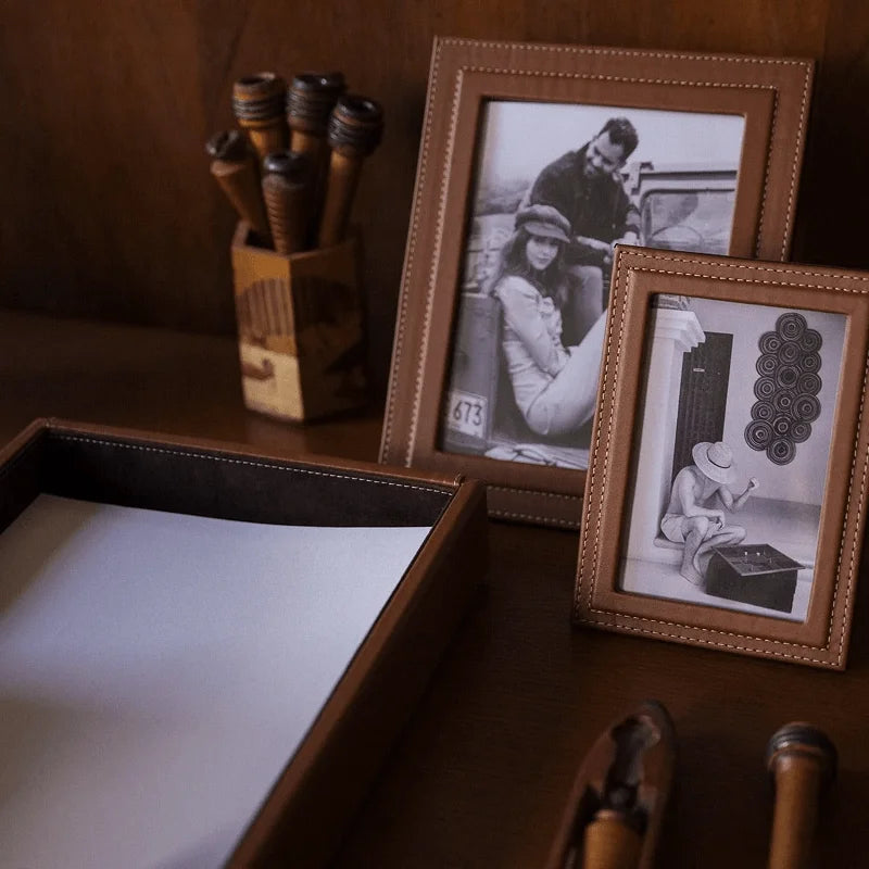 Estuche forrado en cuero y tela, disponible en cueros de color miel, azul y rojo.